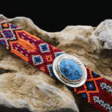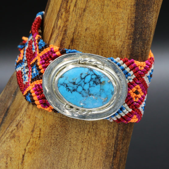 Bijoux créé par INTIMAPU MILENKO – Bracelet en micro-macramé, Turquoise sertie en argent 925. Fermoir bouton turquoise sertie en argent 925.
