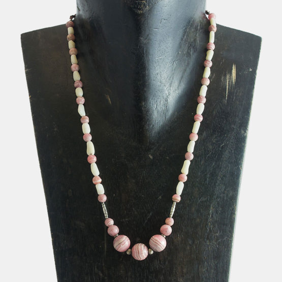 Bijoux créé par INTIMAPU MILENKO –  Collier de perles de rhodochrosite, de nacre et d’argent 925. Finition en micro-macramé avec un nœud coulissant.